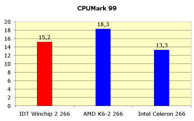 Для маркировки своих 100-мегагерцовых процессоров IDT использует PR-рейтинг, подобный Cyrix. В частности, 266-й процессор, который тестировали мы, работал на реальной частоте 233 МГц (2.33х100 МГц). Для оценки этого рейтинга IDT использует сравнение производительности с процессорами AMD K6-2 по тестам ZD Winstone 99 и ZD 3DWinbench 99.