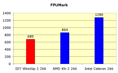 Этот тест показывает производительность целочисленной арифметики и скорость работы подсистемы памяти. То, чторезультат получился ниже, чем у AMD K6-2 говорит скорее всего о том, что в части взаимодействия с памятью Winchip 2 есть куда совершенствовать.
