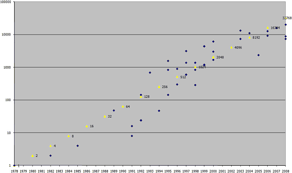 Проще представить эту информацию в виде графика. Тут жёлтые маркеры олицетворяют собой «закон» Мура, синие — реальные процессоры и их скорость P согласно последнему варианту классификации.