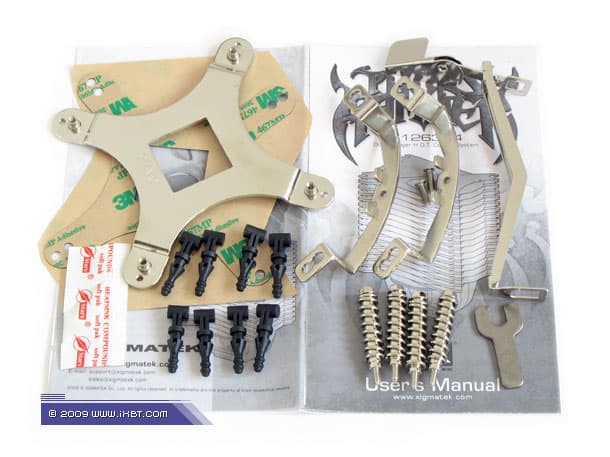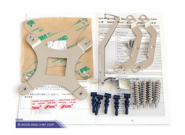 Поставка включает радиатор, набор мультплатформенного крепежа (поддерживаются платформы Intel LGA775, LGA1366 и AMD Socket 754/939/AM2), 8 силиконовых штифтов для фиксации вентиляторов, пакетик с термопастой и техническое руководство (присутствует русскоязычная инструкция).