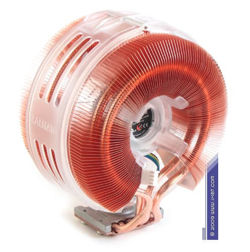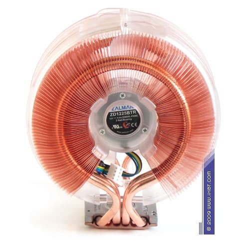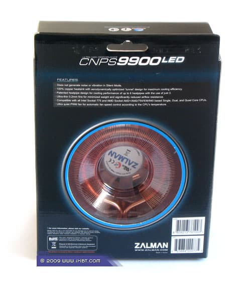 В копилку CNPS9900 следует зачислить также ШИМ-контроль оборотов вентилятора — учитывая повсеместное распространение четырехконтактных управляемых разъемов, нынче это уже не каприз или особая «фича», а самая настоящая норма жизни. Как водится, диапазон регулировки оборотов тут довольно широк (скорость вращения крыльчатки варьируется от 600 до 2000 об/мин) — соответственно, в условиях малой или средней тепловой нагрузки на процессор набортный вентилятор способен гарантировать почти бесшумную работу кулера с сохранением оптимального теплового режима. А тем категориям граждан, кто уделяет пристальное внимание не только техническим, но и моддинговым составляющим систем охлаждения, наверняка придется по вкусу местная иллюминация — ярко-голубые светодиоды, заботливо припасенные веселыми ребятами из Zalman.