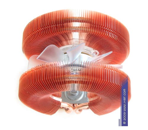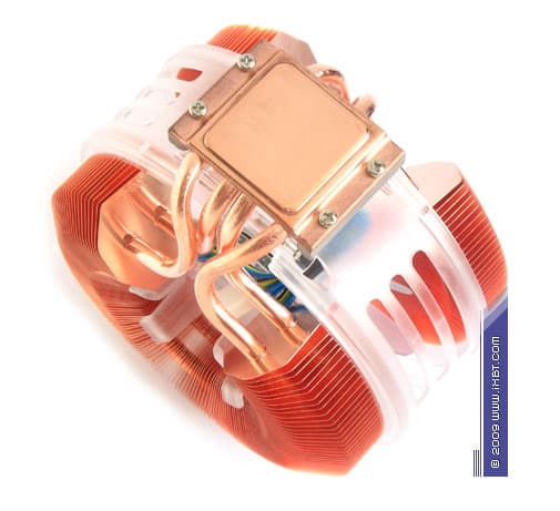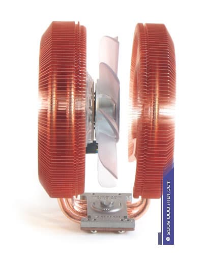 Не без хитрости сделано и форматирование тепловых трубок. Основной их «дуэт» выведен на тыльную секцию оребрения, позади вентилятора по направлению потока — то есть, как раз туда, где и создается наиболее сильный продув межреберных каналов, что сопровождается закономерным повышением интенсивности теплообмена. Причем, теплосъемные элементы ближней к вентилятору трубки (которая находится под максимальным обдувом) поставлены непосредственно в центре подошвы, с очевидным прицелом на эффективную разгрузку самых горячих участков процессорной крышки. Третья трубка включена «перед» вентилятором — там условия для теплообмена несколько иные, предъявляются более жесткие требования к гидравлическому сопротивлению в лицевой секции , поэтому пластины слегка усечены в габаритах и «обслуживаются» только одной трубкой (нагромождение дополнительных трубок в этом фрагменте оребрения не имеет практического смысла).