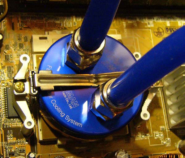 Единственная неприятность была в том, что наш AMD-Socket требовал установки винтов с обратной стороны материнской платы, так что пришлось её выкручивать из корпуса. Нам очень понравилось, что трубки подсоединяются, что называется, намертво, поэтому скобы-зажимы тут скорее как дополнительная защита, чем основное крепление.
