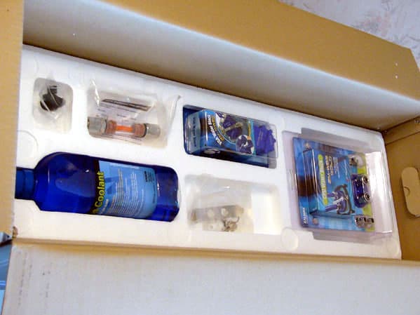Раскрыв «ларец» можно видеть первый слой с водоблоками (каждый из которых упакован в отдельную коробочку), крепежными элементами и бутылочкой с антикоррозийной жидкостью, а на втором слое покоится Он Reserator 1 Plus чёрного цвета. Дело в том, что немалая доля тепла рассеивается не только за счёт непосредственного контакта радиатора с воздухом, но и за счёт излучения, поэтому чёрный окрас является оптимальным.