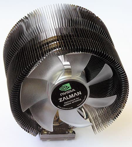 По всей видимости, именно цветовое решение (черный радиатор плюс зеленая подсветка) вкупе с PWM-управлением дало повод производителю написать на кулере надпись «Optimized for NVIDIA NFORCE» и наклеить логотип Nvidia,