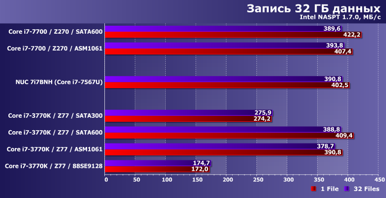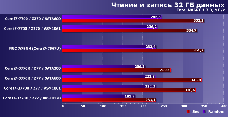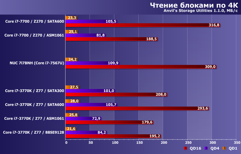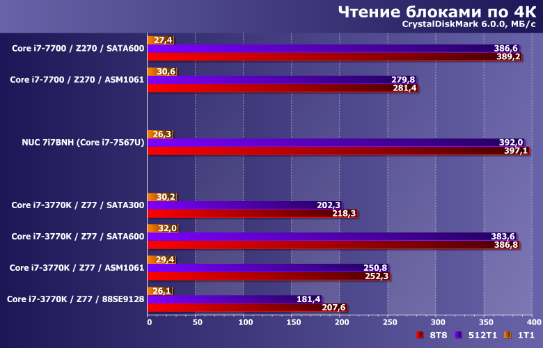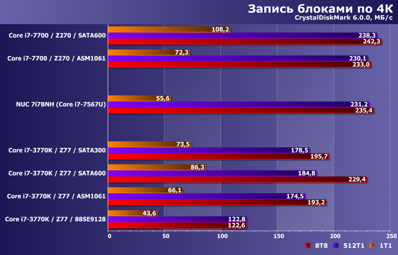 Производительность в этих сценариях никогда не достигает «потолка» SATA-интерфейса, но от его реализации зависит. Правда, также она зависит и от количества «лишних» элементов на пути данных — что всегда «бьет» по дискретным контроллерам. С учетом этого, от чипсетного SATA300 могут отставать не только разнообразные представители семейства Marvell 91хх, но и ASMedia ASM1061. В общем, еще один довод против плат расширения при отсутствии нехватки портов. А если таковая и наблюдается (что бывает редко, но не невозможно) — в пользу использования дискретных SATA-контроллеров только для подключения низкоскоростных накопителей, типа винчестеров. Правда, таковое делает как поддерживаемую версию SATA, так и интерфейс подключения к плате малозначимыми деталями, но так бывает часто.