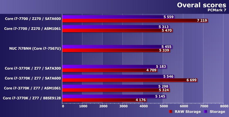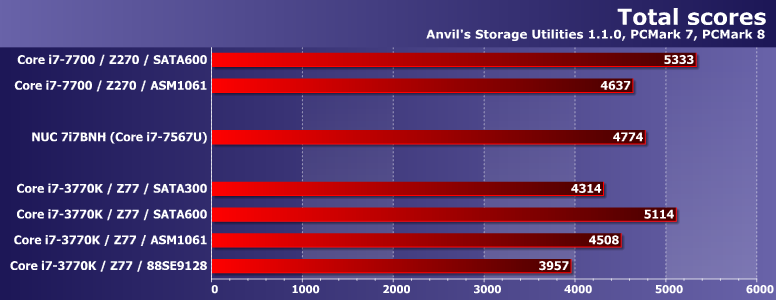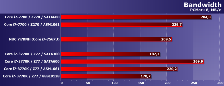 Аппаратное же обеспечение для этой статьи, естественно, поменялось. Впрочем, в качестве эталона так и осталась наша тестовая система на базе процессора Intel Core i7-7700 на плате ASRock Z270 Killer SLI (чипсет Intel Z270). Также недавно мы протестировали SSD SanDisk Ultra 3D в составе Intel NUC 7i7BNH — тоже Core i7 «седьмого» поколения, но мобильный двухъядерный, что сказывается на результатах некоторых тестов.