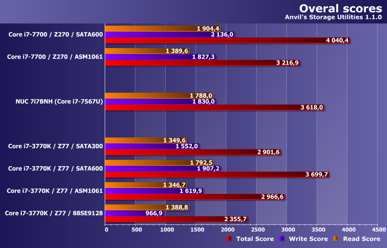 Общие оценки показывают все сказанное выше — но в сжатой форме. В частности, низкоуровневый балл существенно зависит от производительности операций со случайным доступом, а таковая от интерфейса зависит вовсе не линейно. В итоге и разница между портами одного и того же чипсета Z77 не двукратная, а лишь порядка 25%. Что характерно, отставание «старой» платформы от «новой» и при использовании одинаковой версии SATA-интерфейса составляет примерно 10% — с учетом вышесказанного, не так уж и мало. В итоге ее быстродействие оказывается ближе, скорее, к современным мобильным платформам.