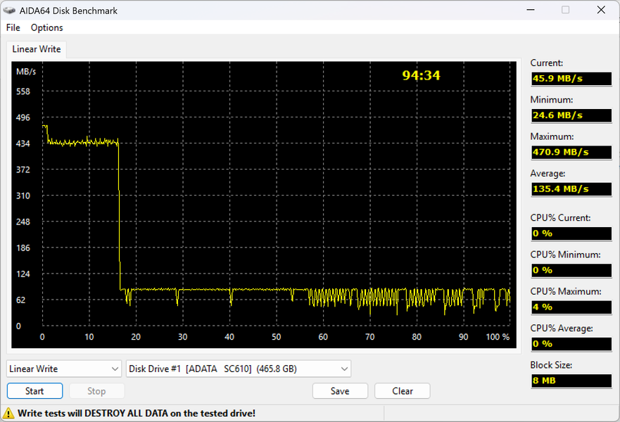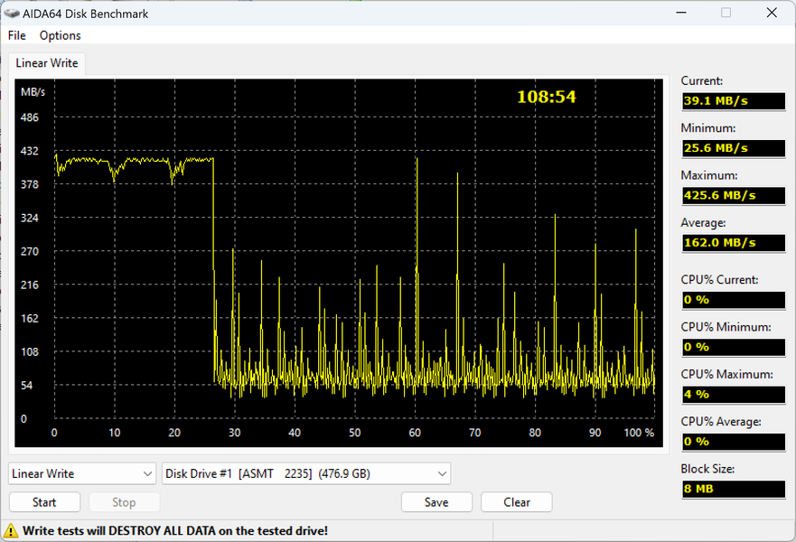 Поведение устройства типично для связки из MAS1102 и QLC Intel, да и на конфигурации из этого контроллера с TLC-памятью во многом похоже. Работа в однобитном режиме так и вовсе от типа памяти не зависит. Максимум скорости — в статической части кэша, но разница со следующими 15% от свободного места пренебрежимо мала, а вот дальше начинается прямая запись в массив памяти — что для QLC-процесс болезненный. Впрочем, если этом поток данных не прекратится, потом еще и старые уплотнять придется, так что скорость снизится еще раз. Точнее, перестанет быть ровной — то поднимаясь до собственных возможностей памяти по записи, то падая из-за необходимости расчистить немного места, чтоб было куда записывать.