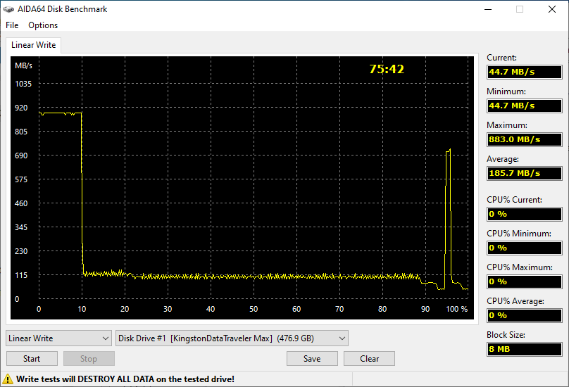 Однако идя на компромисс не стоит забывать о том, что рабочие сценарии могут быть разными. Чтоб было что читать, это нужно сначала записать — а вот с этим у самых дешевых USB-накопителей всё до сих пор сложно. Фактически высокие скорости можно обеспечить только благодаря SLC-кэшированию, а для нормального функционирования последнего нужно как минимум иметь достаточное количество свободного места. За пределами же самого низа бюджетного сегмента пока используется TLC-память — которая от этого эффекта тоже страдает, но не на столько сильно. И тут уже разница может достигать и пяти раз — а не полутора-двух, как при чтении данных. А может и больше оказаться — всё зависит от того, какой процент записываемых данных в кэш попадет, а какой — нет. То есть вроде бы всё плохо. Но сравнительно с более дорогими устройствами. А с обычными флэшками — даже и хорошо, но они не дешевле (либо не сильно дешевле).