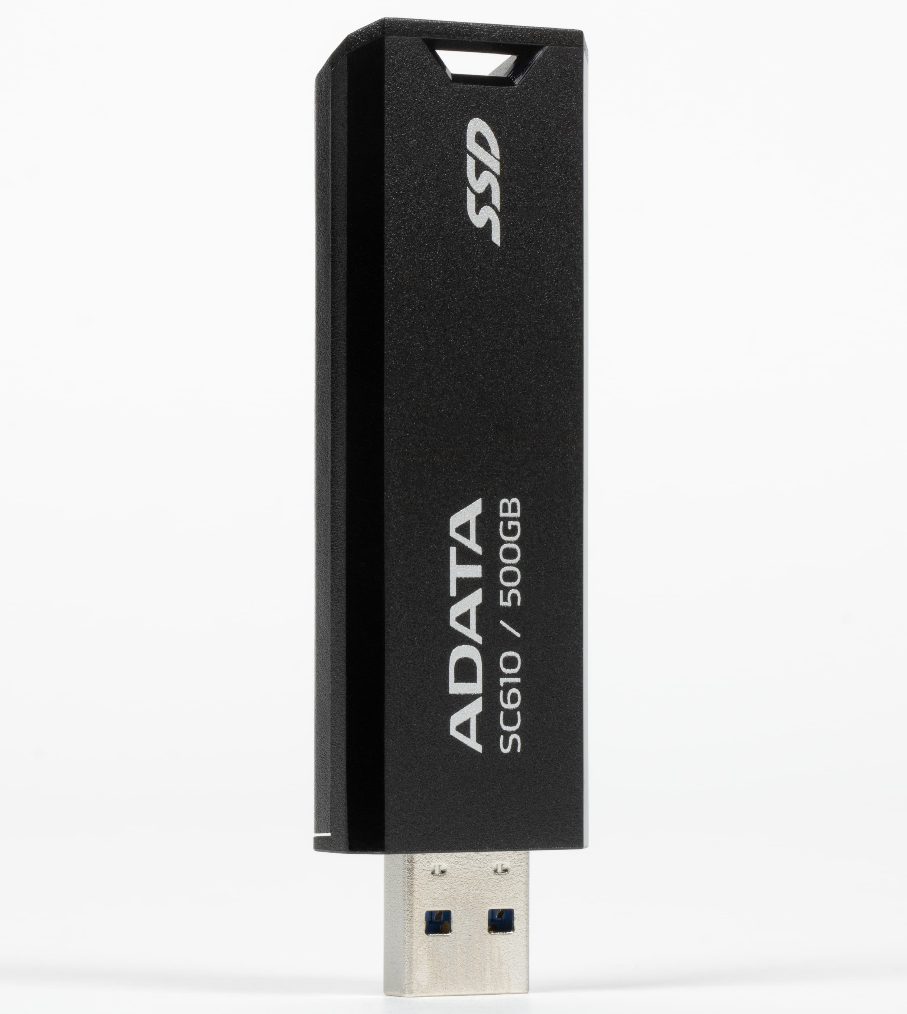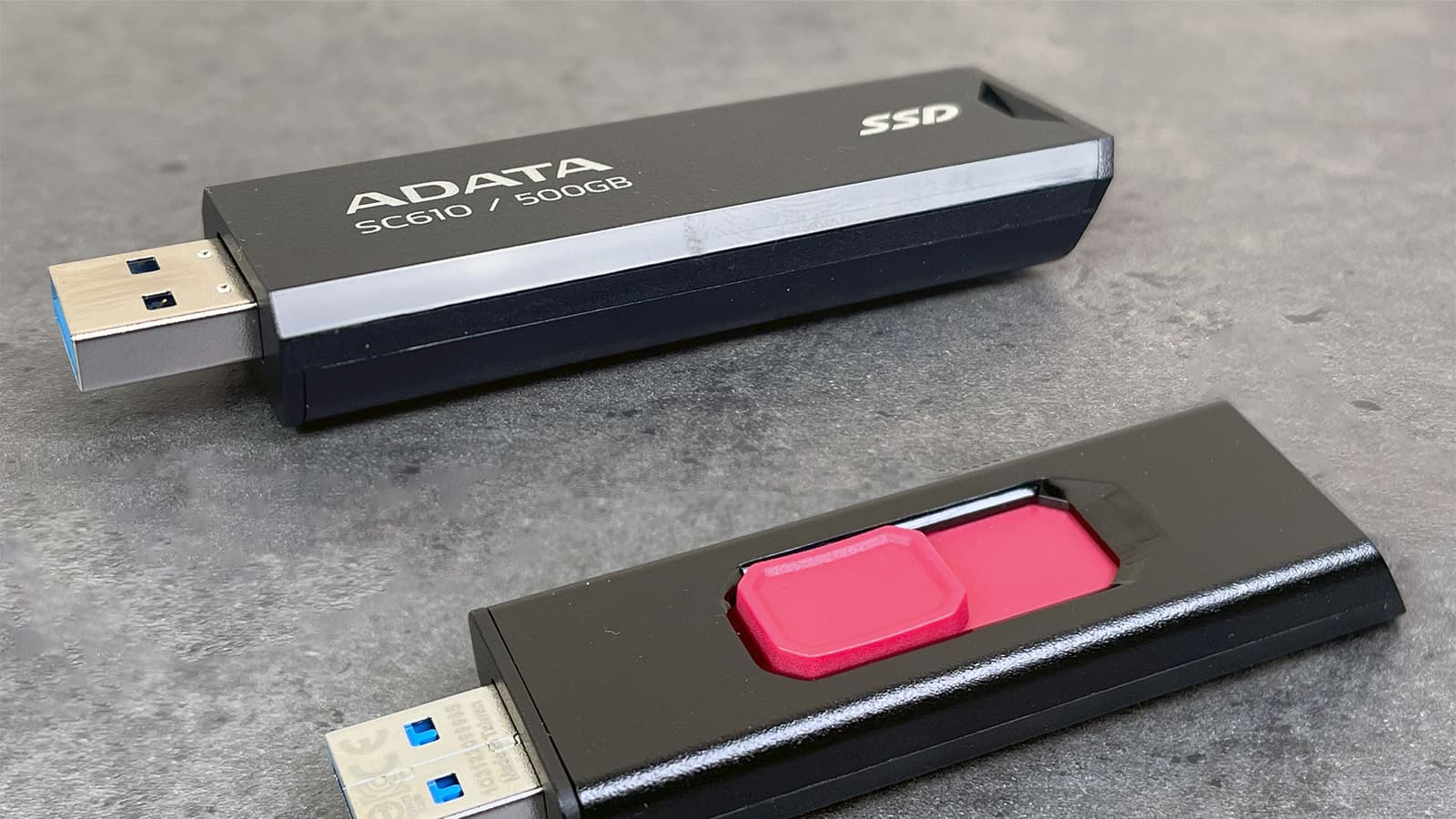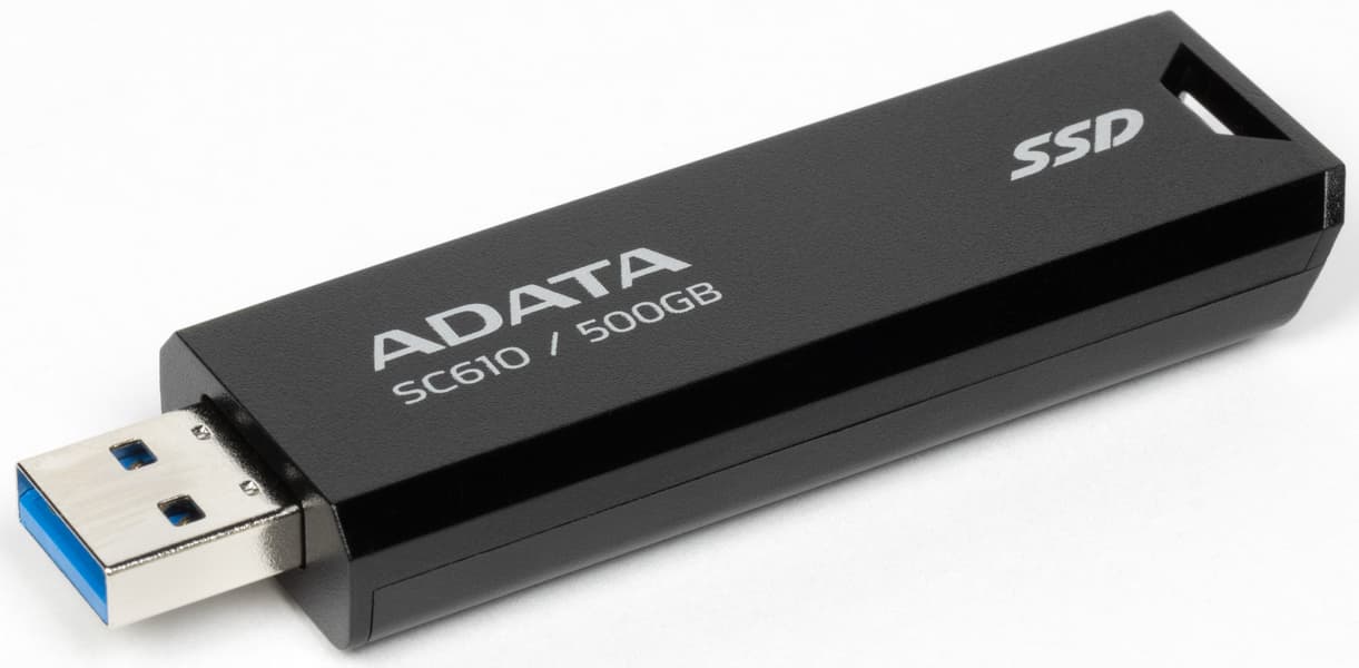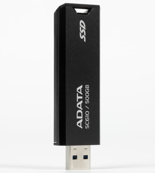Корпус здесь в полном смысле слова флэшечный — сама Adata выпускает массу таких вот пластиковых слайдеров с интерфейсом USB 3.0 и даже USB 2.0, а некоторые линейки достигают и емкости 512 ГБ, напрямую пересекаясь с героем тестирования на этом значении, но практически всегда при чуть более высокой цене. А если нужно дешево и компактно получить 1 или 2 ТБ — то это уже только к SC610. Которого при прямом сравнении лишь немного выдают чуть-чуть бо́льшие размеры — 67×24×10 мм при массе 13 г. Для сравнения: UV128 той же емкости представляет собой аналогичный слайдер, но 60×20×9 мм и 9 г. Заметить разницу можно, только положив их друг рядом с другом. Но спецификации различаются принципиально, равно как и сроки гарантии, и цены — и по всем пунктам не в пользу обычных флэшек.