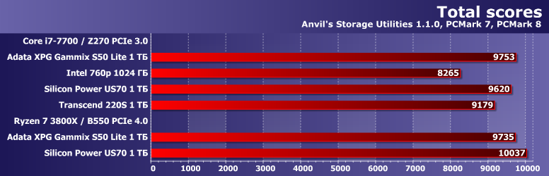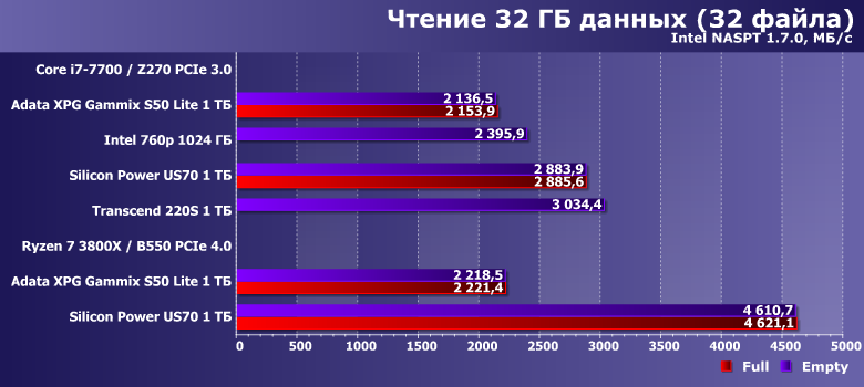 В целом — ничего неожиданного. Старую платформу Intel тест «любит» больше, чем новую AMD — но при прочих равных. Поддержка PCIe 4.0 теми SSD, который ей могут нормально воспользоваться, способна и это скомпенсировать, и еще немного улучшить показатели. Adata XPG Gammix S50 Lite пользу из PCIe 4.0 извлечь не может — поэтому только немного замедляется в циферках. И в заполненном состоянии производительность падает. Т. е. с результатами других тестов все коррелирует идеально — и верно все сказанное выше.