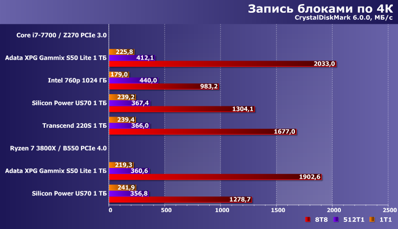 С записью же все было неплохо (во многом — благодаря агрессивному SLC-кэшированию, но как бы не болела — лишь бы померла), а стало еще лучше.