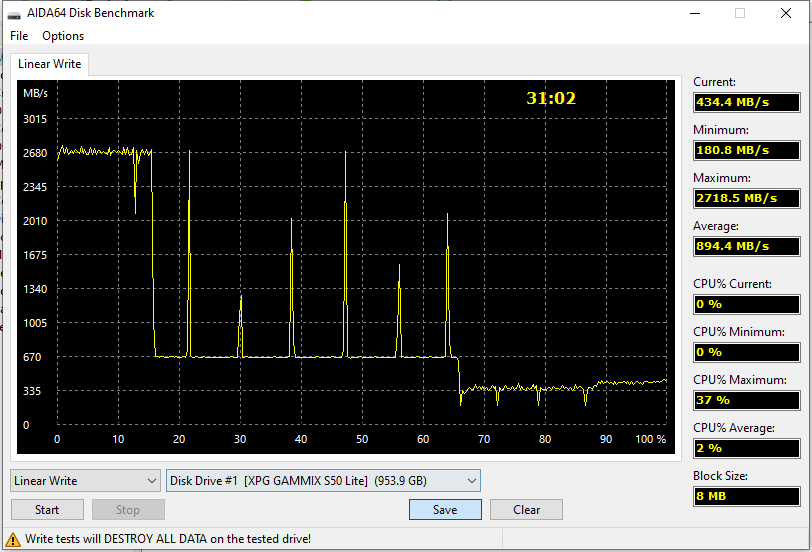 Та же картина. А вот претензии по поводу «бумажной» поддержки PCIe 4.0 ослабевают — как видим (в очередной раз), при записи больших объемов данных она ничего и Phison E16 не давала. Потому, что тут не в контроллере дело. Точнее, не только в контроллере — флэш-память не такой уж и быстрый носитель. Нет, разумеется, «разнести» вдребезги и пополам жесткие диски удалось быстро и не напрягаясь, более быстрые, чем SATA, интерфейсы на практике освоить — тоже, но до «выжимания» многих гигабайтов в секунду на записи даже в простых сценариях еще далеко. Тем более, что борьба за себестоимость вообще тянет SSD-индустрию совсем в обратном направлении: остались бы на MLC, так все бы получилось. Правда и купить подобный терабайтник даже сейчас было бы многим не по средствам — в отличие от.