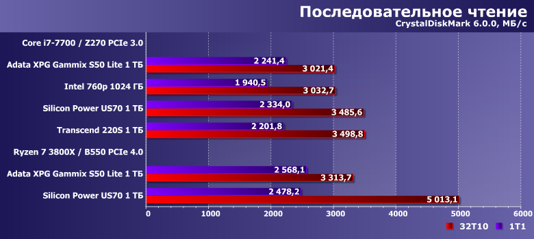 Для оценки прогресса Silicon Motion нам бы идеально подошло что-нибудь на SM2263 с терабайтом TLC-памяти, но ничего подобного мы не тестировали. С другой стороны, разработчик контроллера позиционирует SM2267 куда выше. Поэтому мы решили взять результаты Transcend 220S на Silicon Motion SM2262EN и «старичка» Intel SSD 760p, где применяется еще оригинальный SM2262. Память в обоих одинаковая — 64-слойный TLC-флэш Intel с кристаллами по 256 Гбит, т. е. более быстрый, чем в Adata XPG Gammix S50 Lite — зато контроллер более медленный (особенно в последнем случае — что и делает 760p слишком невыразительным с точки зрения современности).