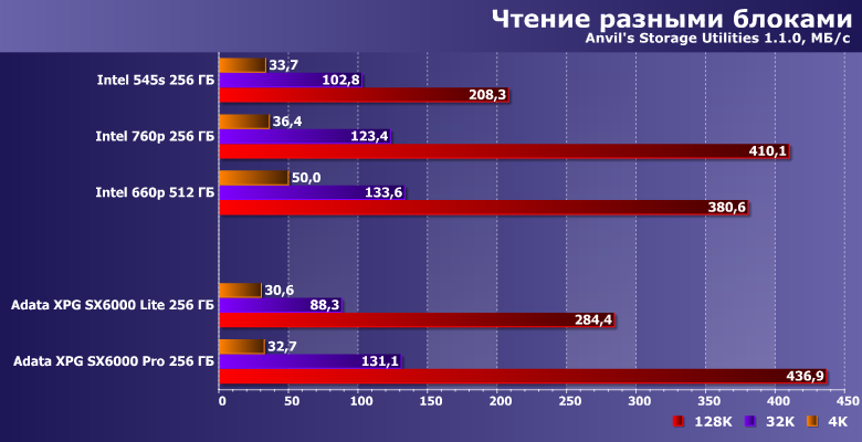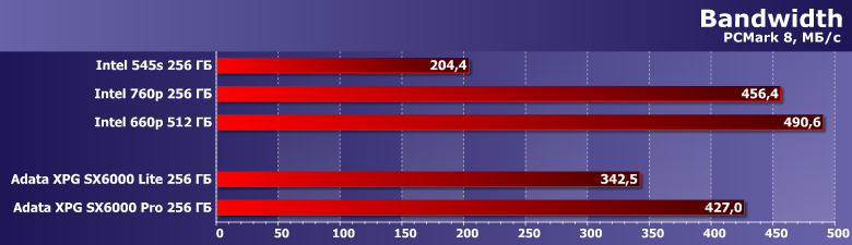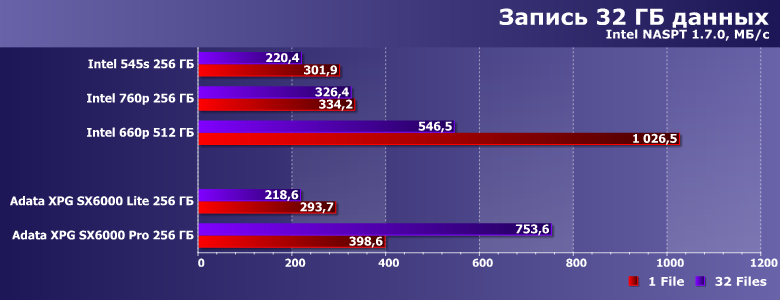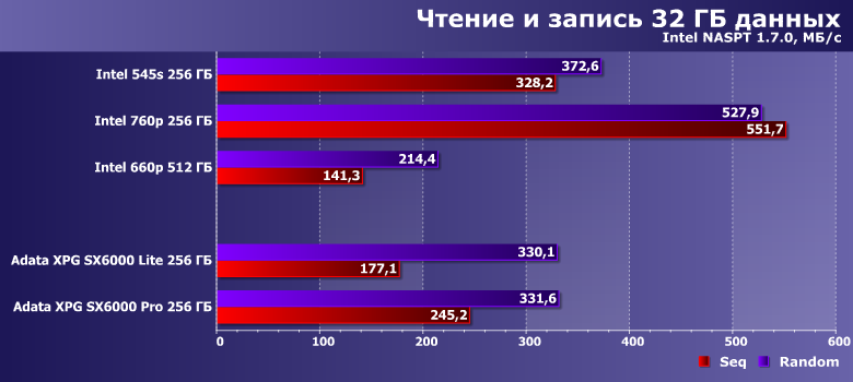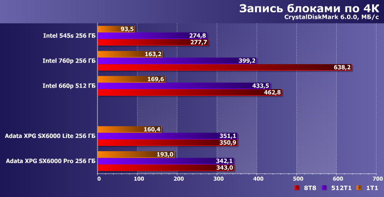 Запись же всем дается похуже — в этих случаях недорогие NVMe-накопители невысокой емкости не всегда превосходят теоретические возможности SATA. С другой стороны, недорогие SATA-устройства невысокой емкости от них еще дальше — и всегда с «нижней стороны». Забавнее здесь то, что оба накопителя Adata способны работать быстрее, чем более дорогие модели Intel.