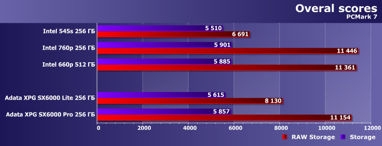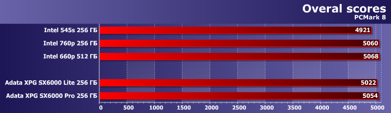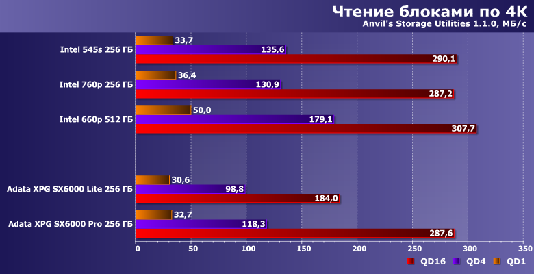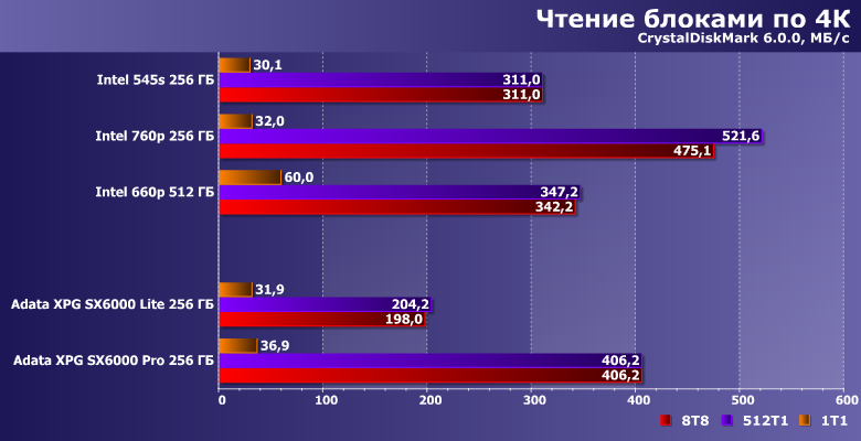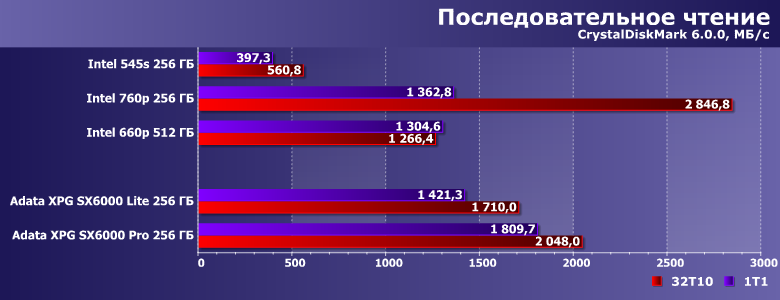 Разумеется, в первую очередь важно сравнение SX6000 Lite и SX6000 Pro. А для оценки их места в современном мире мы взяли тройку накопителей Intel на той же памяти. 545s — как раз как пример «хорошего SATA», у которого 6000 Lite по цене вполне может даже выиграть. 760p — в первую очередь как ориентир для SX6000 Pro: что могло бы быть на той же памяти при той же емкости, но менее бюджетном контроллере. И еще 660р — просто для очередной оценки перспектив QLC-памяти. Правда, емкость вдвое больше, чем у остальных испытуемых, но тут ничего не поделаешь: не бывает в этой линейке меньше, чем 512 ГБ.