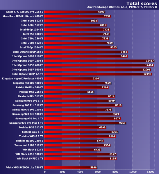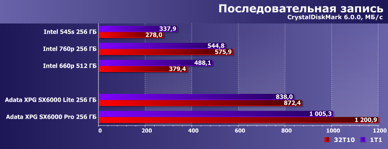 На что здесь стоит обратить внимание — даже «медленная» TLC все-таки быстрее «хорошей» QLC в заметных количествах, как ее не подстегивай SLC-кэшированием. А мы не удивимся, если на практике SX6000 Lite «придется» успешно конкурировать и с такими устройствами тоже. Пусть и от более именитых производителей. Впрочем, на момент тестирования Intel 660p в Москве продавался дешевле (при равной емкости), а вот некоторые другие...