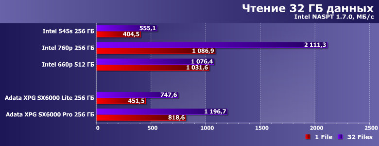 Если же обращать внимание на скорость линейного чтения, то, понятно, что SATA и вовсе ничего «не светит» при любом раскладе, а Lite в отдельных сценариях не такой уж и «лайт».
