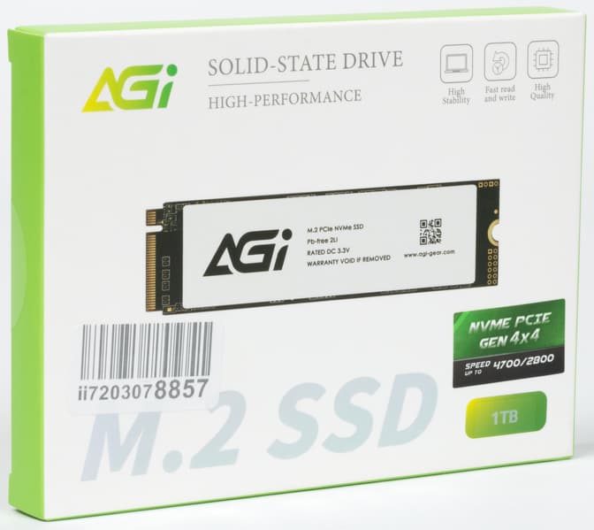 В том числе, и успевших засветиться совсем в других конфигурациях — например, изученный нами прошлой осенью Silicon Power UD85 тогда базировался на контроллере Phison E19T и TLC-памяти YMTC, но сейчас их таких уже и не осталось. Во всяком случае, при емкости в 1 ТБ чаще попадается либо Phison E21T и 176-слойная QLC-память Micron, либо в точности то же самое, что мы сегодня будем тестировать. Поэтому мы неоднократно предупреждали, что ориентироваться на обзоры конкретных бюджетных моделей нужно очень аккуратно — хотя бы дату проверять требуется обязательно. Но платформ на деле не так уж много, и научиться ориентироваться в их разнообразии можно. А вот какая конкретно попадется — уже нередко дело случая. AGI пока, повторимся, в играх с вариативностью конфигураций замечен не был, а существующие модификации хотя бы прямо документированы и имеют разные артикулы. Но полагаться на то, что так будет всегда, тоже не стоит — такой уж сегмент сам по себе.