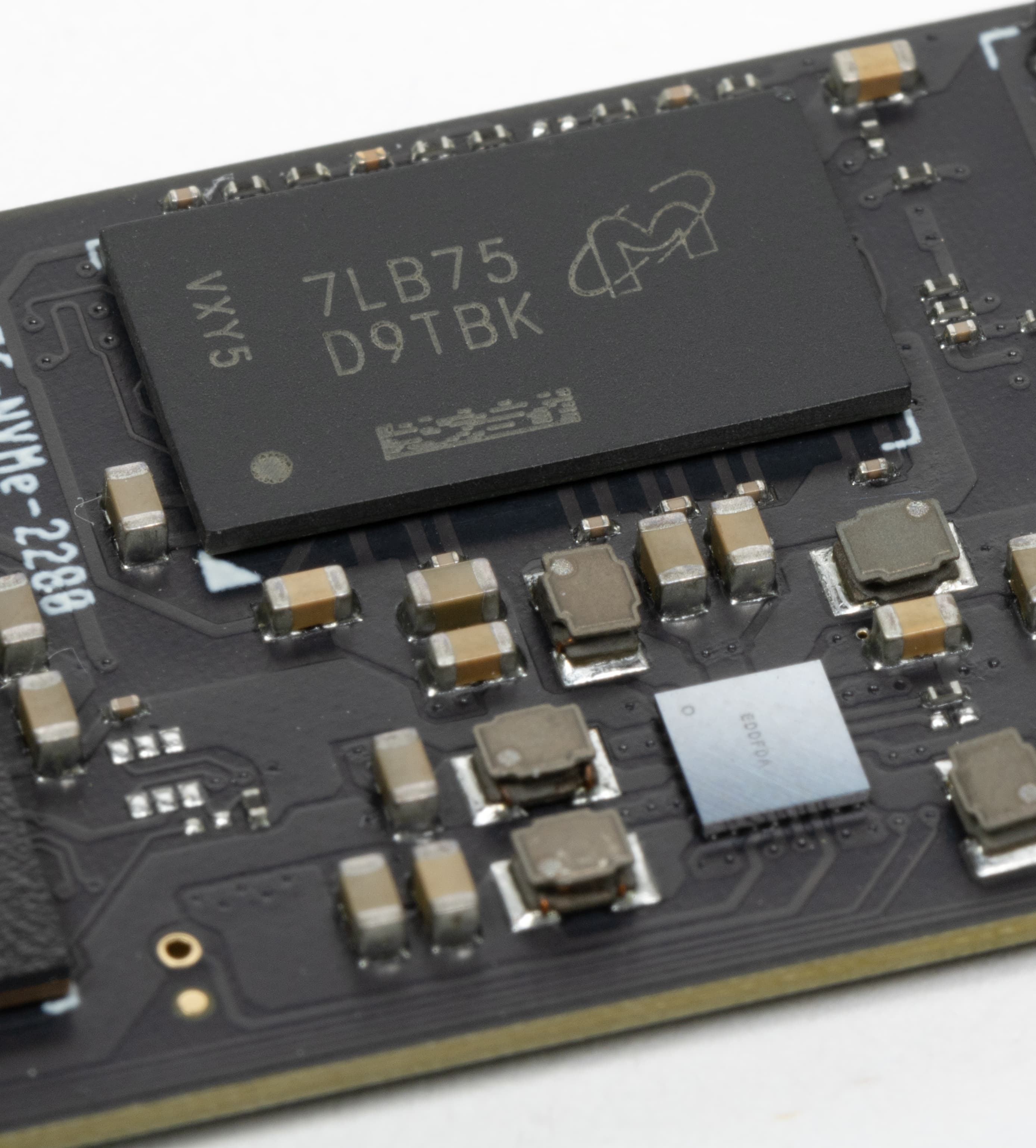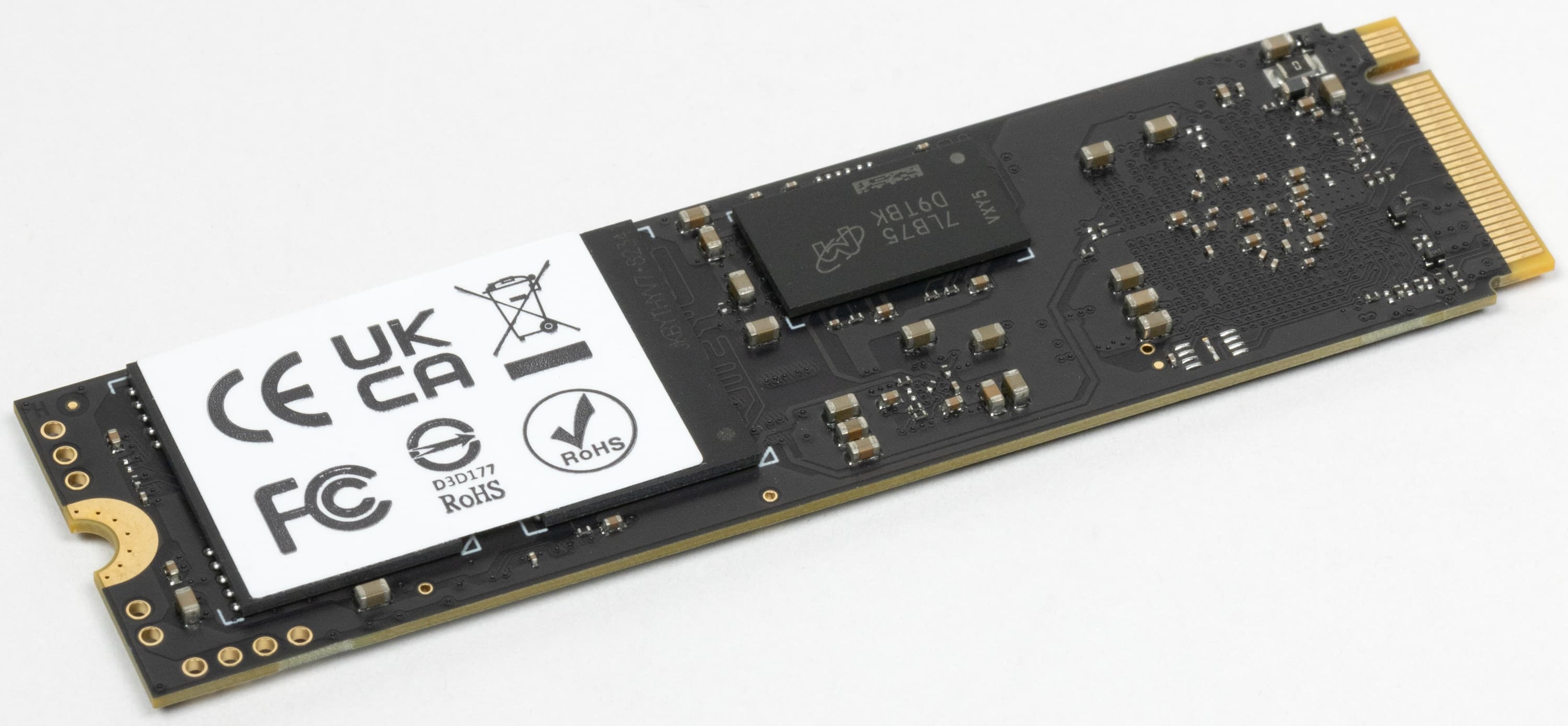 Даже на лицевой стороне наклейка не слишком велика, так что позволяет полюбоваться на контроллер и один из чипов DRAM. Последняя произведена Micron, хотя ранее сплошь и рядом встречались чипы SK Hynix.