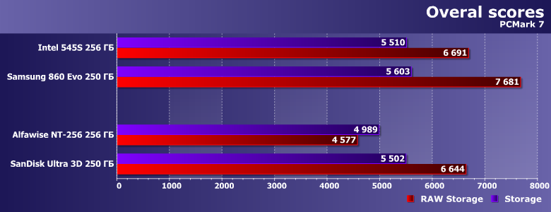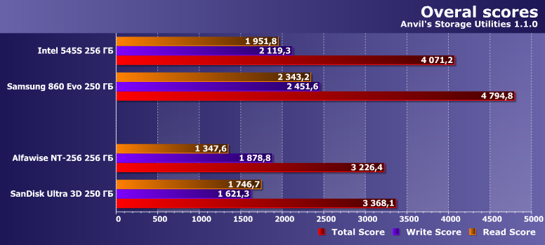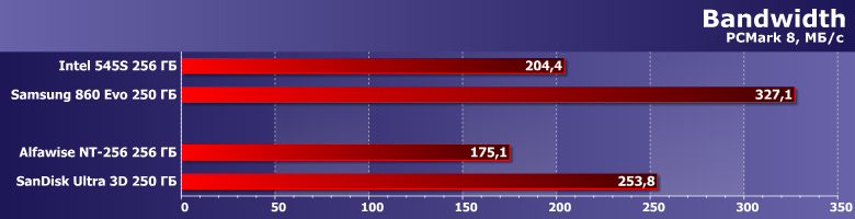 Вспоминая все виденное выше, не удивительно, что по меркам этой программы Alfawise NT-256 даже чуть быстрее, чем SanDisk Ultra 3D 250 ГБ — за счет выигрыша в тестах записи. И в очередной раз убеждаемся, что про емкость при выборе забывать нельзя. Например, у Samsung в линейке 860 Evo разница в производительности между 250 и 500 ГБ практически отсутствует (что делает первый вариант как бы не самым интересным накопителем на четверть терабайта вообще), а в ассортименте SanDisk/WD такое изменение сразу меняет скорость на 15%-20%. Т. е. в принципе различия между двумя соседними «родственниками» в одном ряду могут оказаться более весомыми, чем между радикально разными продуктами. Ну а вообще такая емкость начинает постепенно превращаться в что-то «стартовое» и не более того — для некоторых линеек накопителей являясь уже минимальной. Придется уходить выше. Или наоборот — попробовать сэкономить, приобретая продукт более низкого уровня.