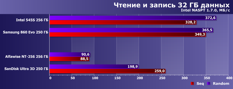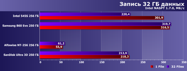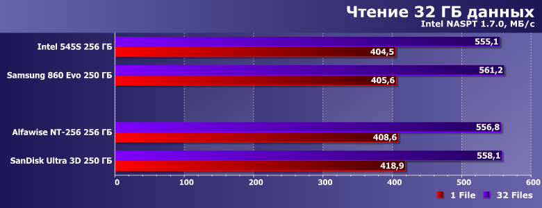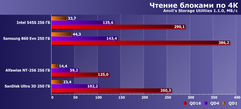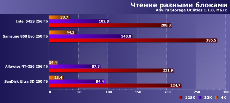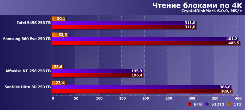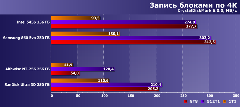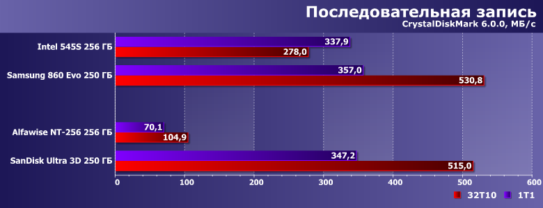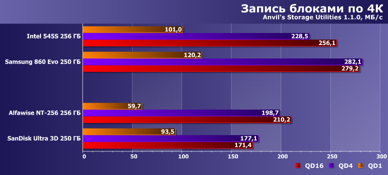 Традиционно не комментируем чтение — в настоящее время создать накопитель, «тормозящий» в подобных сценариях, создать очень сложно. Хотя и можно, но для этого придется специально постараться :)