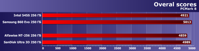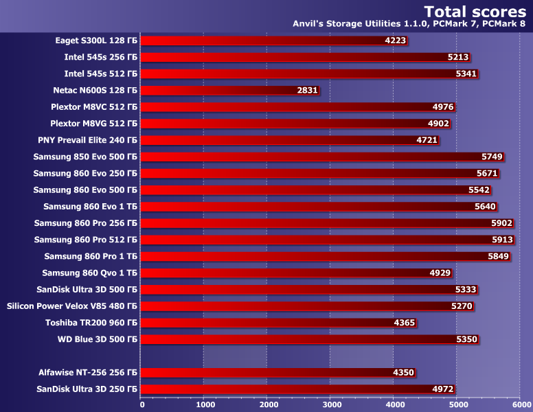 Что интересно, предыдущая версия пакета оперирует более легкими нагрузками — но в ней различия между испытуемыми возрастают. Вопреки житейской логике. Но в целом говорит она нам тоже самое — использовать какой угодно SSD в качестве системного накопителя какого-нибудь медиацентра (где не предполагается интенсивных дисковых нагрузок) не только можно, но и нужно. И можно даже самый дешевый достаточной емкости — поскольку более дорогие отличаться принципиально не будут.