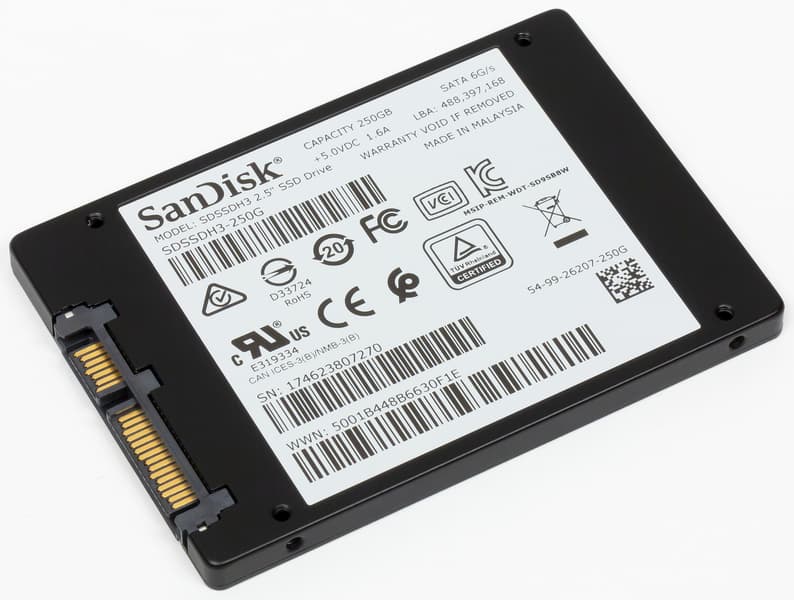 В данном случае мы никаких сюрпризов не ожидали, благо тестировали уже и SanDisk Ultra 3D 500 ГБ, и WD Blue 3D 500 ГБ, убедившись в их аппаратной идентичности. Контроллер Marvell 88SS1074 и 64-слойные кристаллы флэш-памяти BiCS 3D NAND TLC совместного производства SanDisk и Toshiba — и немного различающаяся прошивка. На момент упомянутого тестирования была уже запущена программа по увеличению гарантийного срока для Blue 3D до пяти лет — а вот с Ultra 3D никакой ясности в этом вопросе не было. Сейчас — есть: тоже те же пять лет. Почему мы решили вернуться к уже не новой линейке? Потребовались результаты младшей модели в семействе, а таковой как раз и является версия на 250 ГБ. Есть подешевле — WD Green / SanDisk SSD Plus соответственно, но бюджетным сегментом мы подробно займемся в следующий раз. Сегодня — «младший из средних», благо аналогичные решения Intel и Samsung тестировали уже, так что пора и WD заняться.