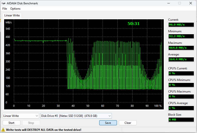 Netac же должен был работать как Kingston, но оказался быстрее. Правда, график получился какой-то невменяемый — сначала было даже ощущение, что мы не ту версию программы взяли (новые зачем-то делают паузы в работе, а современный SSD в это время начинает пытаться быстро-быстро очистить кэш). Но что времени ушло всего 50 минут — верится: тут минимальная скорость оказалась самой высокой среди всех испытуемых. Максимальная — ниже, так что пиковые показатели в тестах низкого уровня должны быть похуже, а на практике — как повезет.