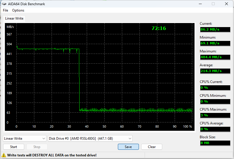 AMD R5 тратит на весь процесс немногим больше времени, но пребывает всего в двух состояниях — либо на максимальной скорости данные пишем, либо уже строго меньше 100 МБ/с. Правда и на максимальной скорости можем больше записать, чем на ВХ500 — зато на минимальную раньше перейдем. В общем, не всё просто. По полному времени на запись всего объема вышло сопоставимо. Хотя больше часа на всего 0,5 ТБ это в принципе печально, но другого никто не ожидал.