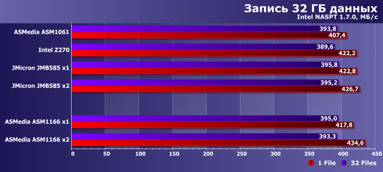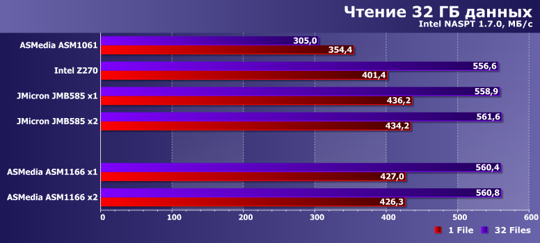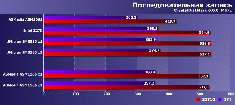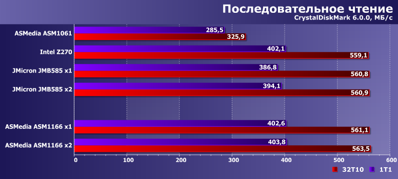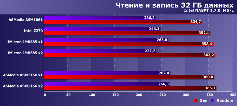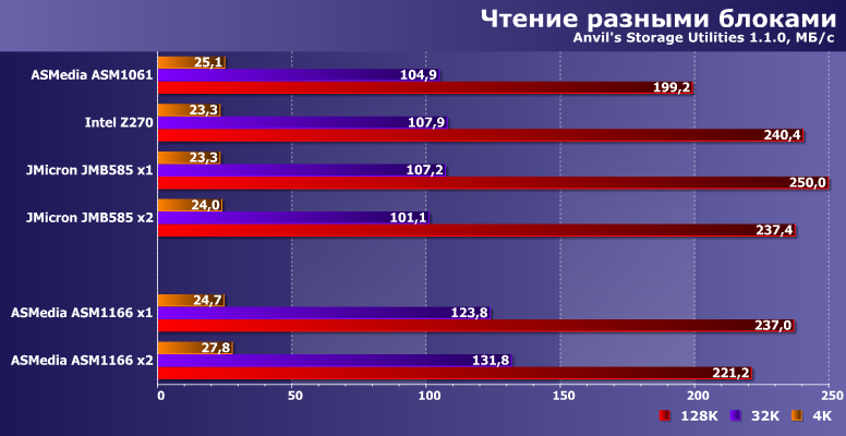 Результаты приводим просто для ознакомления — понятно, что в первую очередь они определяются используемым SSD. Но хорошо заметно, что ASM1061 может и на них сказаться — отрицательным образом. А вот новые контроллеры местами даже быстрее чипсетного, во что несколько лет назад сложно было бы поверить.