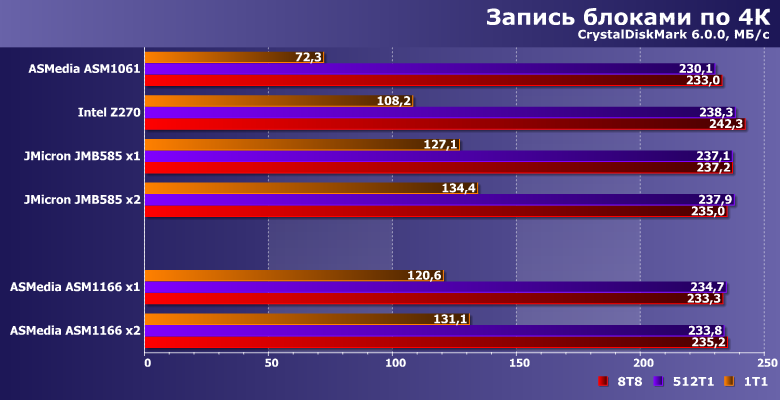 Хотя в целом по совокупности с точки зрения низкоуровневых показателей Z270 все-таки быстрее наших главных героев. Но не существенно — можно считать, что все равноценны. Так что с нехваткой портов что ASM1166, что JMB585 справляются отлично — и ничему не мешая.