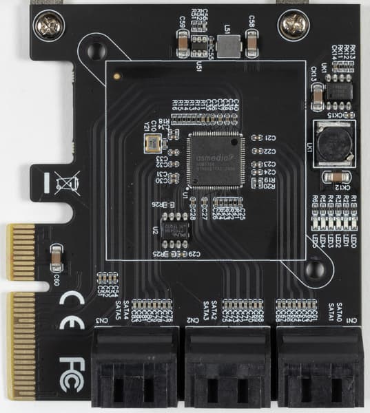 Для чего в таких условиях могут пригодиться «двухлинейные» чипы? В более сложных случаях нежели простое расширение количества портов — например, для софт-RAID, производительность которых будет ограничиваться уже не примерно 800 МБ/с (PCIe 2.0 x2 — лучшее, что могла «бытовуха» десятилетней давности), а 1,7 ГБ/с. В любом случае, старший ASM1166 обеспечивает лучший «курс обмена» PCIe на SATA, нежели JMB585, не говоря уже о чипсетах. Да и никто не мешает при необходимости ограничиваться для него подключением по одной линии PCIe 3.0, «превращая» таковую в уже шесть портов SATA600 — что в принципе целиком и полностью решает проблему нехватки портов данного типа в современной системе.