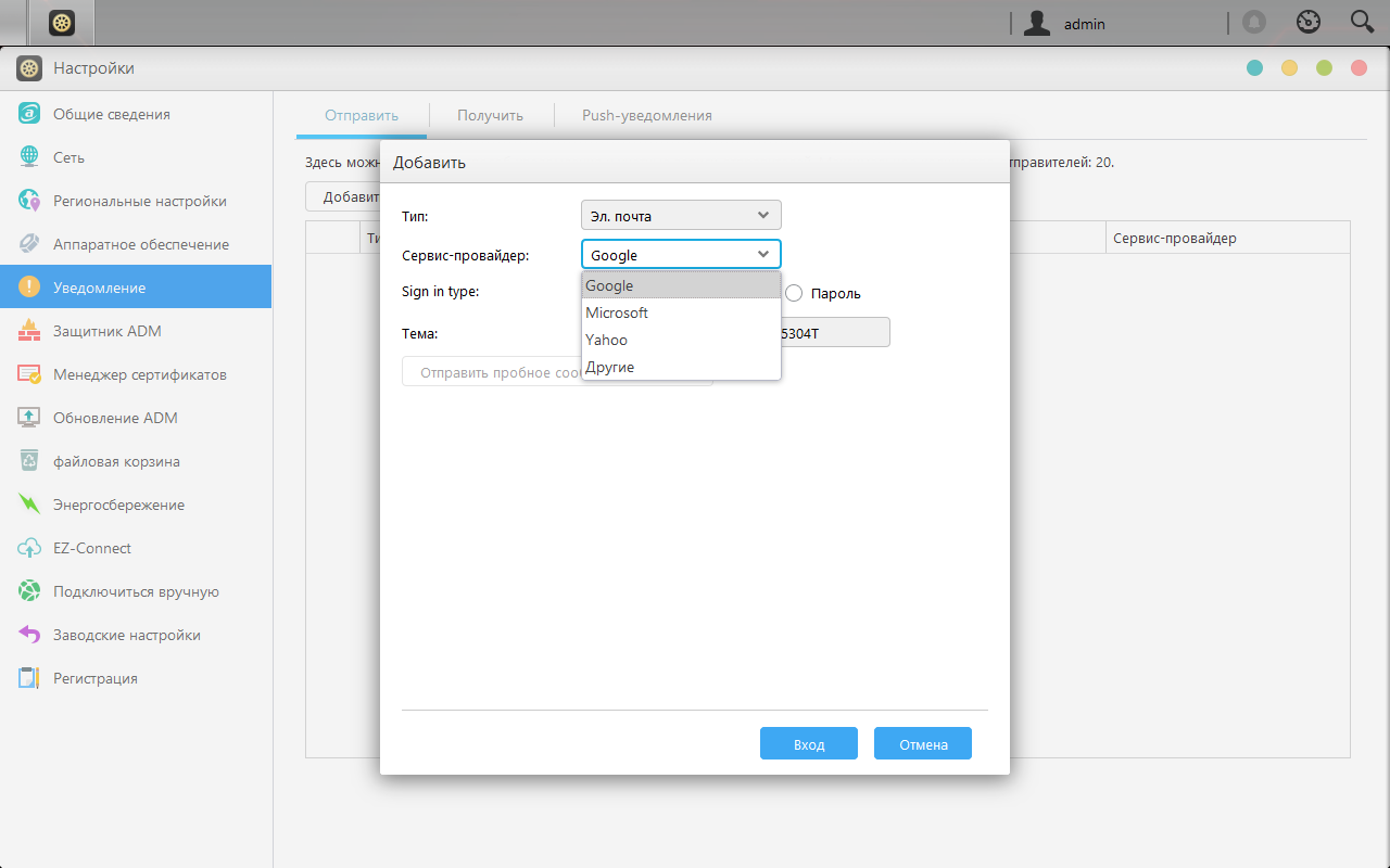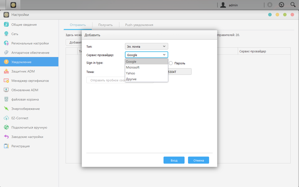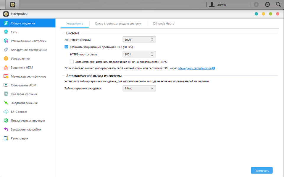 В отличие от других производителей, собственно параметры конфигурации сетевого накопителя разнесены по нескольким разделам. Прежде всего, это пункт «Настройки». Традиционно здесь есть пункт обновления прошивки (есть и сервис автоматической проверки и уведомления о новых версиях), сброса настроек (сохранение и восстановление конфигурации осуществляются в модуле резервного копирования), региональные параметры.