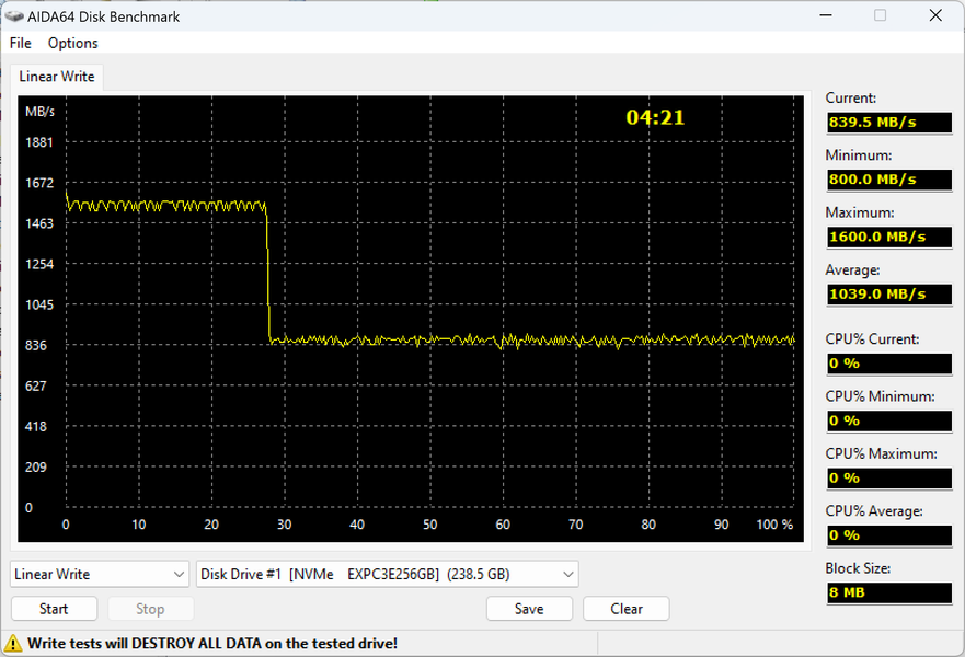 Поддержка SLC-кэширования в Archon нашлась. Но это малюсенький статический кэш, который на практике мешать никак не будет. Основной объем прописывается непосредственно в TLC-массив на скорости порядка 1,2 ГБ/с. Что ниже положенного по спецификациям, но, в очередной раз повторим, методики определения официальных характеристик разные (и это не AIDA64), да и реально это всё равно солидный запас для современной техники.