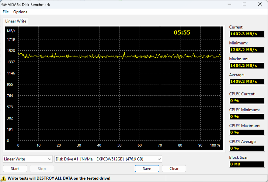 Думаем, можно обойтись одним комментарием к обеим диаграммам. Операции чтения — задача простая, поэтому оба раза мы просто измерили пропускную способность PCIe Gen3 x2 — то есть внешнего интерфейса. Получили немного разные результаты, но для разных режимов это нормально. Да и для разных носителей тоже. Плюс-минус два лаптя от Солнца за счет немного разных способностей в «нормальном» режиме, чуть-чуть сказывающихся и в «ограниченном».