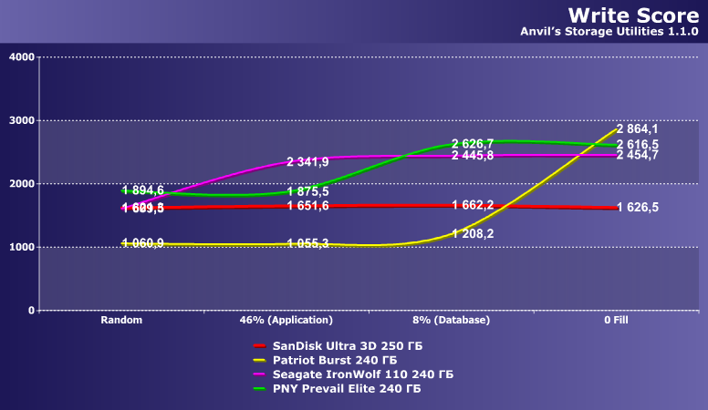 И в таком «предельном» случае он тоже бодро наращивает производительность и выходит в лидеры. Оба SF — скромнее в обоих смыслах. А, главное, не так уж в этом случае что-то улучшать и требуется — SanDisk Ultra 3D на уже достаточно старом контроллере от типа данных не зависит и все равно работает быстро. В полтора раза быстрее, чем IronWolf 110 на той же памяти.