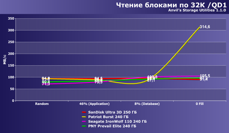 «Эталонному» SanDisk Ultra 3D все равно, что читать — как и должно быть. SandForce и его наследникам — не все равно: порядка 40 МБ/с на нулях мы получаем дополнительно. Почему не больше? Потому, что данные все равно нужно читать, обрабатывать и «выдавать» на интерфейс. Но, в любом случае, хуже не становится. Особенно если говорить про «старые» накопители — в те годы скорость чтения была сама по себе более низкой, так что и прирост от подобных ухищрений в относительном исчислении более весом. Patriot Burst теоретически тоже должен демонстрировать увеличение производительности, а практически «потолком» тут можно считать собственные возможности контроллера: вот столько и не более он может выдавать на интерфейс в однопоточном режиме.