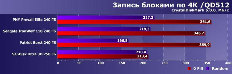 Скорость записи меняется в куда более широких пределах. Тройка накопителей на случайных данных работает одинаково, затем двое начинают ускоряться по мере увеличения количества нулевых данных. S11 вообще медленнее прочих — но когда нулей «много», то проскакивают уже и заполненные ими целиком блоки, так что производительность повышается до уровня SanDisk Ultra 3D. А на чистых нулях он и вовсе догоняет Seagate с PNY, благо для всех троих это практически одинаковый (в данной программе) и идеальный случай.