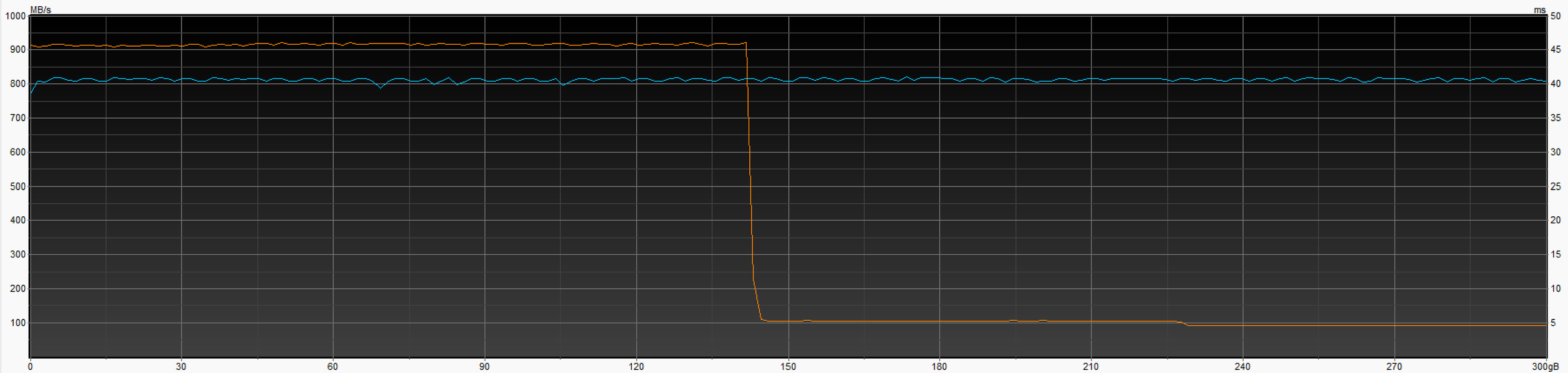 На Adata Elite UE800 не получается выбрать для тестирования в HD Tune весь объем (как мы уже сказали, и у этой программы свои глюки бывают), но и 300 ГБ достаточно, чтобы в очередной раз убедиться в недостатках оригинальных прошивок. Память здесь достаточно быстрая, пусть ее и меньше, чем в двух других участниках тестирования, однако быстро записать можно лишь треть свободного места — далее лишь 100 МБ/с. А при проблемах с Trim, например, место под кэш нормально расчищаться не будет, так что скорость низкой окажется почти со старта.