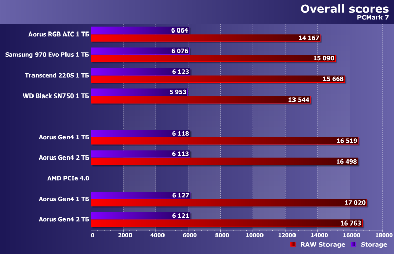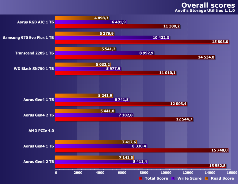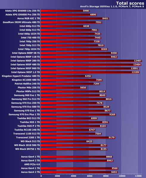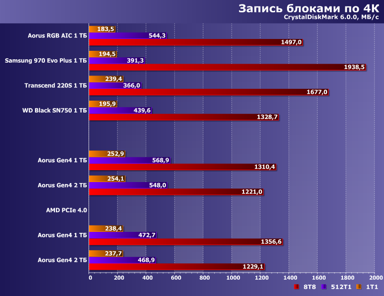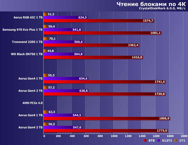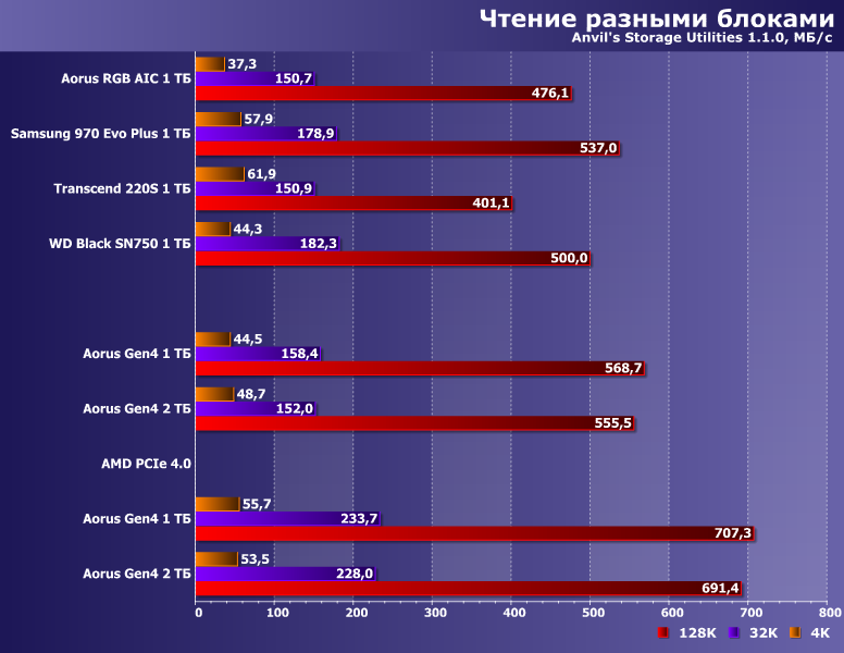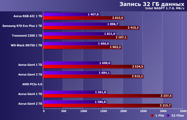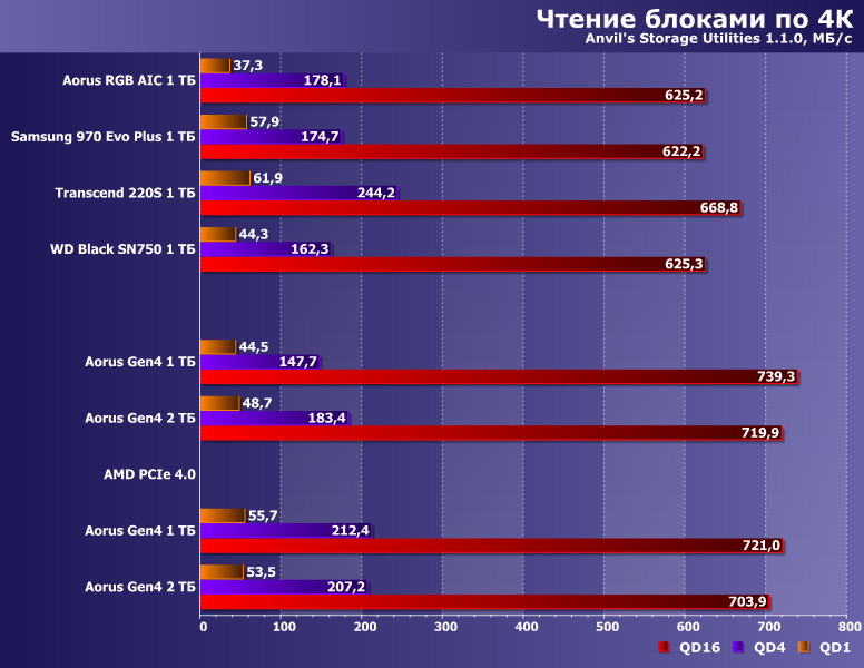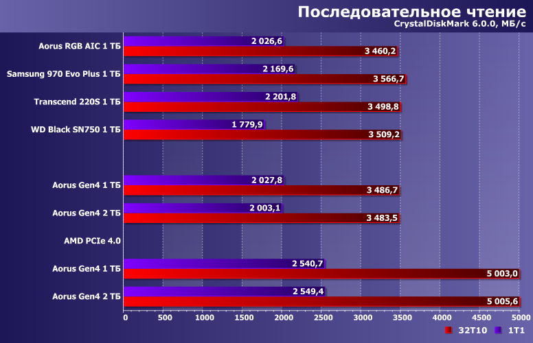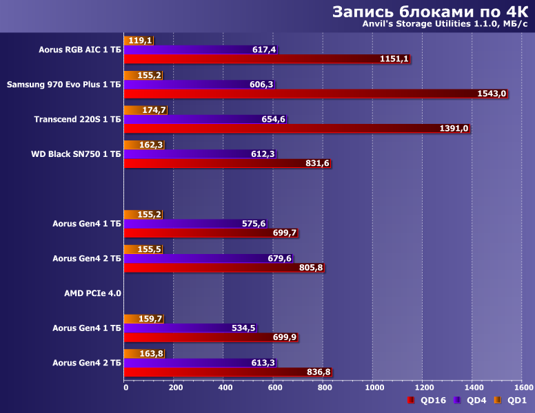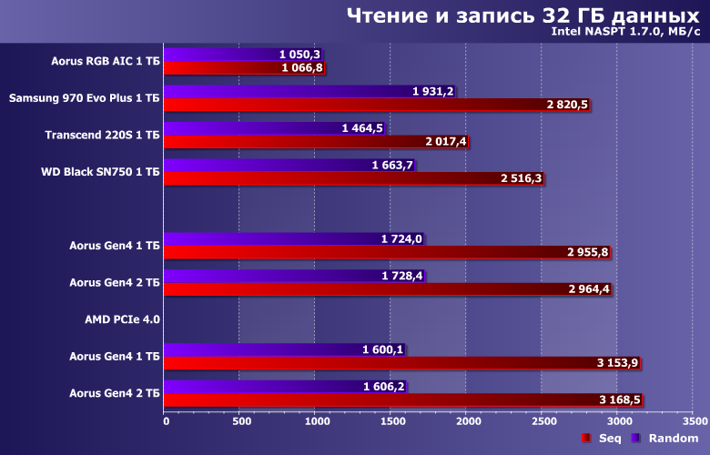 В пользу того, что изменился контроллер, говорят и результаты этих тестов: на память «провал» Aorus RGB AIC не спишешь, поскольку в WD Black SN750 точно такая же. Да и предыдущим контроллерам Phison были свойственны подобные проблемы. Судя по всему, при разработке Е16 «узкое место» было найдено и устранено — и из аутсайдеров накопители превратились в лидеров. Только вот в очередной раз не благодаря интерфейсу: на рандоме переход на платформу AMD (а другого способа получить PCIe 4.0 на данный момент нет) только снижает скорость, а при линейных нагрузках Aorus Gen4 и так самые быстрые.