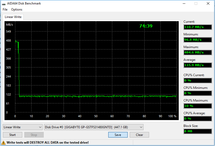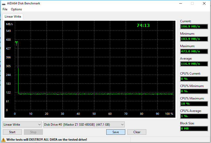 Внутри накопителя была обнаружена 96-слойная 3D NAND TLC BiCS4 Kioxia с кристаллами по 512 Гбит — но на графике последовательной записи по всему объему это практически никак не сказалось: он идентичен полученному на устройствах с меньшими кристаллами BiCS4 на 240 и 480 ГБ. То есть и это можно считать общей особенностью данной линейки прошивок.