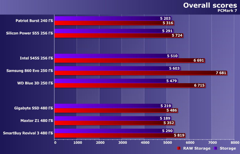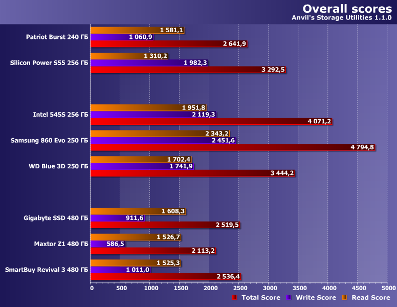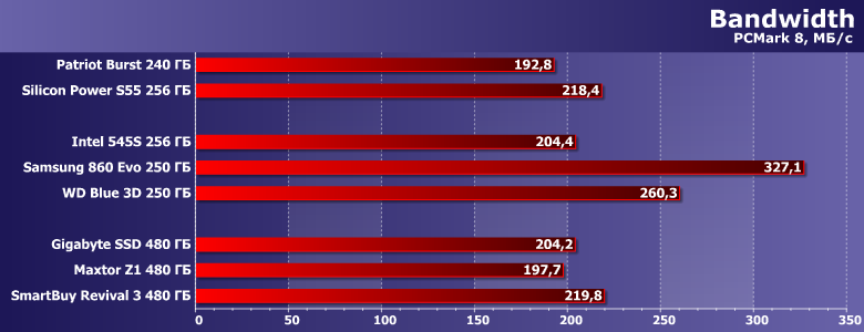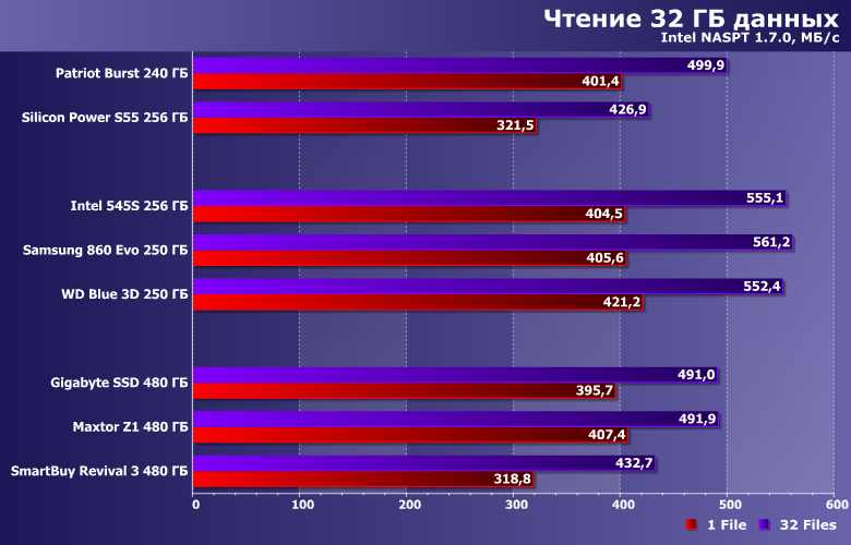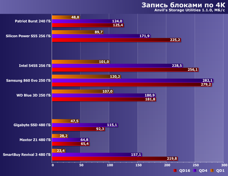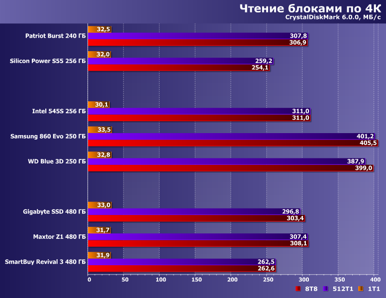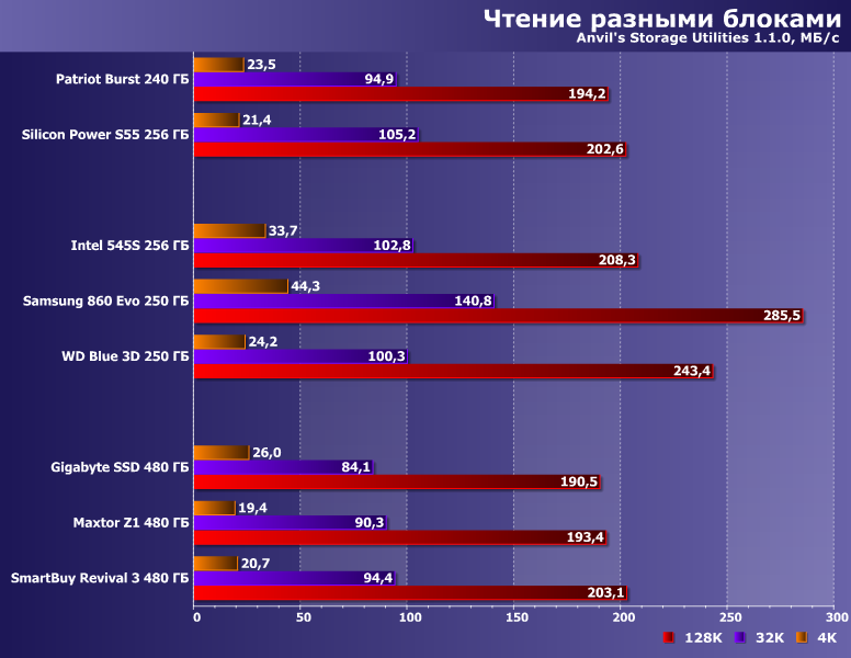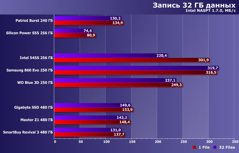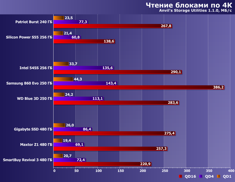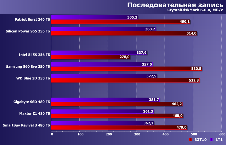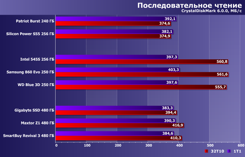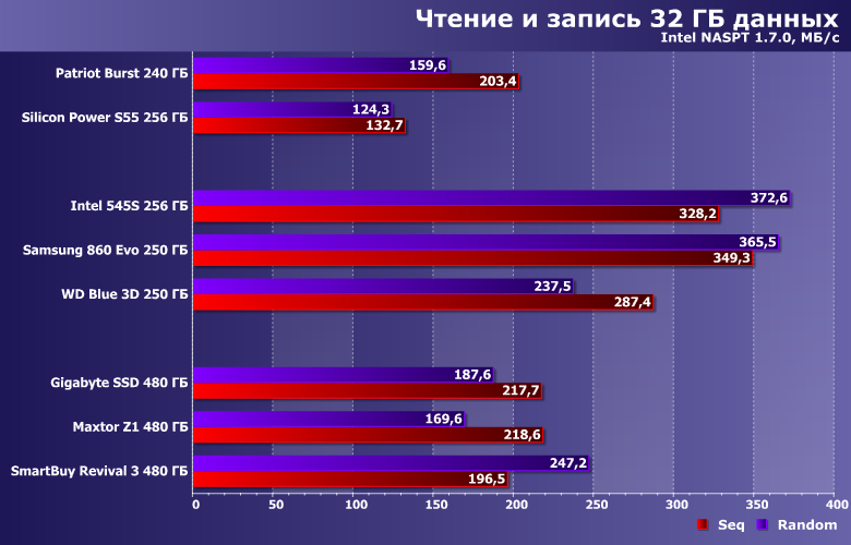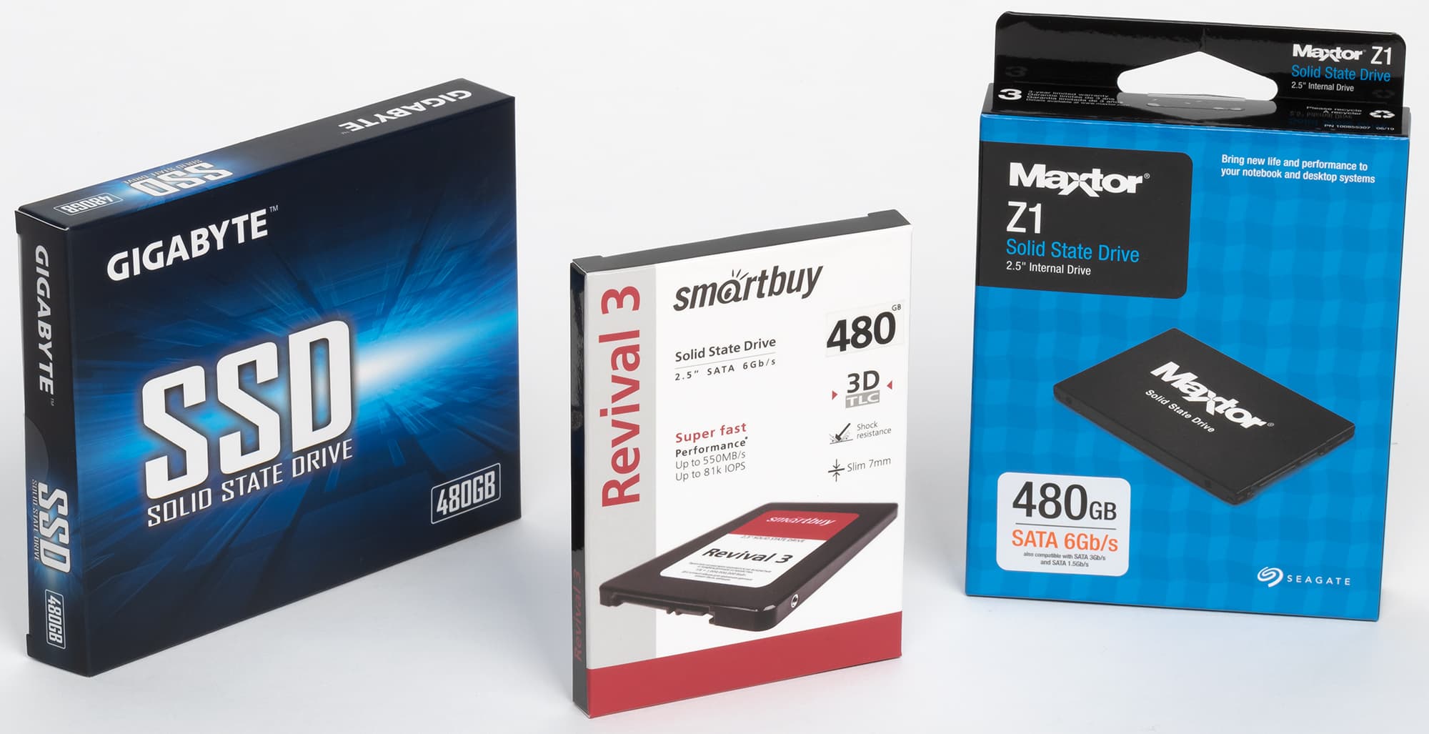 В качестве таковых мы взяли пару моделей из предыдущего тестирования: на базе все того же Phison S11, но с 240 ГБ памяти BiCS4, как в Gigabyte и Maxtor (Patriot Burst), и 256 ГБ 96-слойной 3D TLC NAND Micron (Silicon Power Slim S55) — прошивка сходная с попавшим к нам в руки экземпляром SmartBuy Revival 3 480 ГБ. Кроме того, возьмем три модели среднего класса: Intel SSD 545s, Samsung 860 Evo и WD Blue 3D емкостью 250/256 ГБ. Выбор между «середнячком» и бюджетником на полтерабайта стоит на самом деле нечасто, поскольку слишком уж различается цена на них. А вот в таком раскладе сравнение совершенно практическое: выбор между уровнем выше и емкостью больше за сопоставимые деньги.