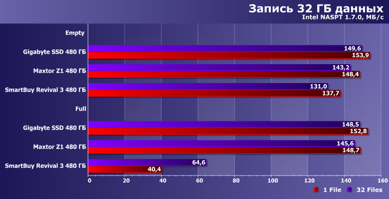 Поэтому для тройки сегодняшних героев мы повторили тесты записи и в случае, когда на них свободно всего 100 ГБ — чтобы приблизить результаты к более реальным условиям, нежели тестирование пустого устройства. И сразу же между ними появилась разница — обеим моделям на BiCS4 это никак не помешало, поскольку производительность лимитирует скорость прямой записи во флэш. Невысокая — но «агрессивные» алгоритмы кэширования в SmartBuy Revival 3 и это «дно» с треском пробивают. И все получается еще хуже, чем у Silicon Power S55 в аналогичном состоянии.