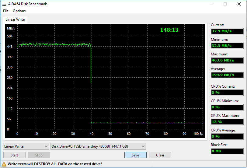 Но тут мы столкнулись с прошивкой SBFMBB.3 — и совершенно другому поведению накопителя: более похожему на модели с 96-слойной памятью Micron или... основанные на контроллере SM2258XT. Под кэш уходит практически все свободное место, далее оно кончается — и SSD нужно как «принимать» новые данные, так и перезаписывать старые в более «плотном» режиме, для чего приходится непрерывно стирать только что записанные блоки. Проблему усугубляет то, что S11 «послабее» того же SM2258XT, так что скорость падает до 32 МБ/с, а на запись всего объема требуется более двух с половиной часов. Для сравнения, Hikvision C100 960 ГБ на той же памяти и SM2258XT затратил на подобную операцию около 162 минут. Но записал за это время 960 ГБ, то есть вдвое больше, чем Revival 3 за 148 минут.