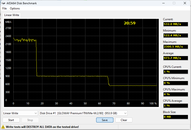 Алгоритмы работы «внутри» накопителя становятся такими же, как и в предыдущем случае, так что и проблемы те же. Если, конечно, считать таковые есть — и считаются таковыми конкретным пользователем. Внимание заслуживает то, что Gloway Premium SSD при необходимости загонять данные в основной массив «сдувается» куда сильнее, чем Silicon Power XD80. Но причина этого уже указана — чередование разное. Во времена актуальности платформы в качестве топового решения терабайтники были не медленнее (а то и быстрее), чем двушки из-за использования разных по емкости кристаллов памяти. Но, как видим, груз тогдашних знаний не стоит тянуть в сегодняшний день.