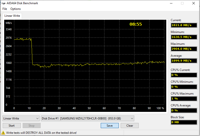 А как должен выглядеть современный топовый накопитель хотя бы в узких рамках PCIe Gen3 (которые при записи до сих пор далеко не всегда узкие) нам показывает Samsung PM9A1. Тут даже вне кэша данные удается записывать со скоростью более 1,5 ГБ/с, а какой-то штраф за его расчистку в конце отсутствует. То есть то, что не раз было уже сказано: вчерашний топ — это, конечно, топ, но вчерашний. Сегодня воображения не поражает. И может даже уступать бюджетному продукту — но сегодняшнему.