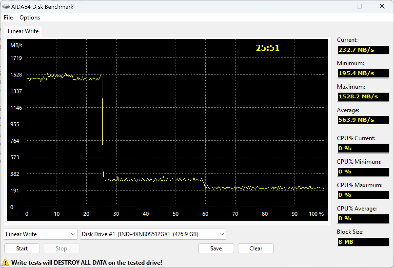 Небольшие различия есть, но принципиальными их назвать сложно. У Kingston NV1 скорость записи в SLC-кэш немного выше, да и сам он чуть больше. Зато уменьшение размеров кэша в Indilinx 4XN80S позволяет начинать его уплотнять чуть раньше, чем свободные блоки кончатся вообще, что увеличивает скорость записи в этом случае. Нормальный размен — причем полное время по второй схеме оказалось немного меньшим.