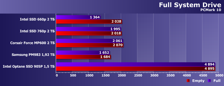 Но сразу понятно, что спасать это будет не всегда. А в некоторых сценариях — никогда: вот даже по скорости заполнения данными видно, что она практически не выше, чем у того же Samsung PM983 — большое количество кристаллов флэша спокойно разгоняется до тех же 2 ГБ/с. Во многом за счет того, что «большое» — но для получение высокой общей емкости оно и требуется в обязательном порядке. Если достаточно низкой, то там все по-другому — тот же «старичок» 900Р на 280 ГБ в своем классе самый быстрый: поскольку все модели семейств 900Р/905Р по скорости практически одинаковы, а вот флэшовые модели очень сильно масштабируются по емкости. Только вот и она за одинаковые деньги оказывается очень разной. А как и что будет получаться в разных сценариях при примерно равной — сейчас и посмотрим.